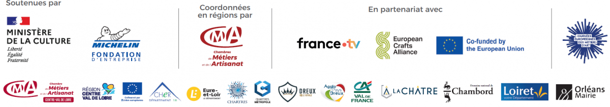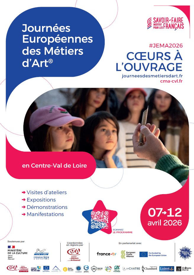 L’Institut pour les Savoir-Faire Français (ancien INMA) pilote et coordonne les Journées Européennes des Métiers d’Art®. En région Centre-Val de Loire, il s’appuie sur la Chambre de Métiers et de l’Artisanat Centre-Val de Loire avec le soutien de l’Union Européenne (FEDER) et de partenaires territoriaux.